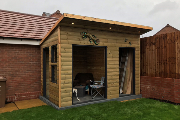 - Board the outer face walls with either sheathing plywood or treated cladding e.g. 19mm x 125mm / 150mm treated shiplap, 25mm x 100mm loglap. If budget allows, consider a thermal cedar cladding or composite cladding for large garden sheds